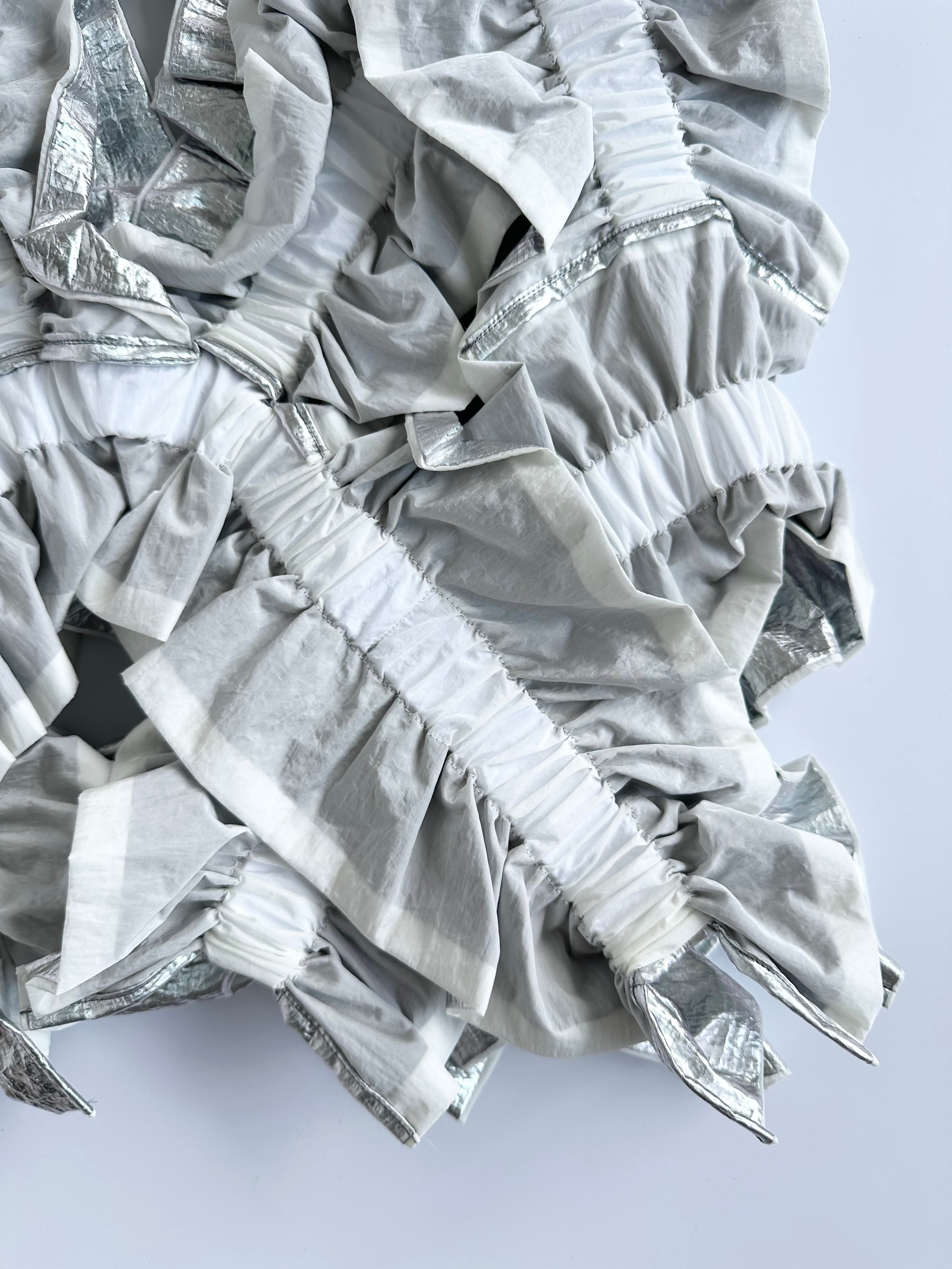・箔コーティングを施したナイロン100%のオーガンジーと、ハリのあるナイロンタフタをドッキングしたベスト